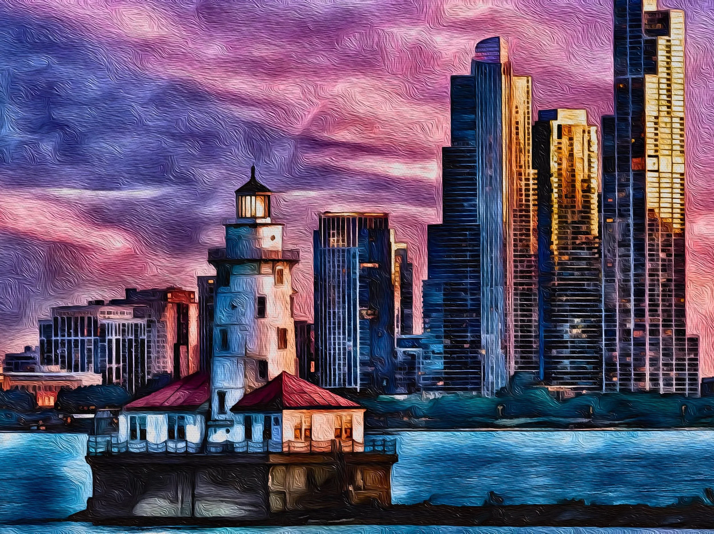 This vibrant cityscape features the iconic Chicago skyline rising behind a historic lighthouse at the water's edge. Painted in rich purples, blues, and warm golds, the scene captures the quiet contrast between steady light and a constantly changing city.