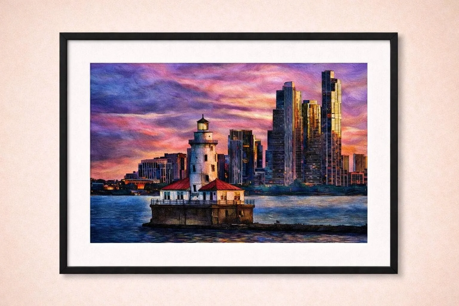 The lighthouse stands as a calm foreground presence against glowing skyscrapers and a dramatic sunset sky, creating a piece that feels both grounded and luminous. Perfect for lovers of Chicago, lakefront views, and artwork that blends architecture with atmosphere.